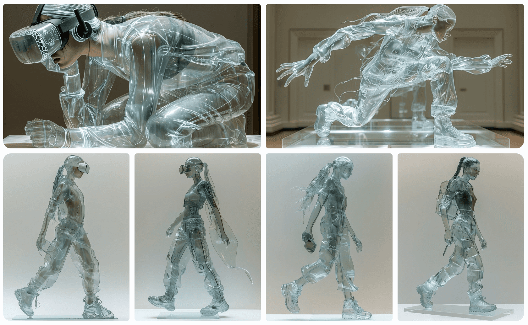 a clear, full-length glass sculpture depicting a female playing game looking into the camera, VR in hand, neon blue vein --chaos 20 --ar 16:9 --stylize 990